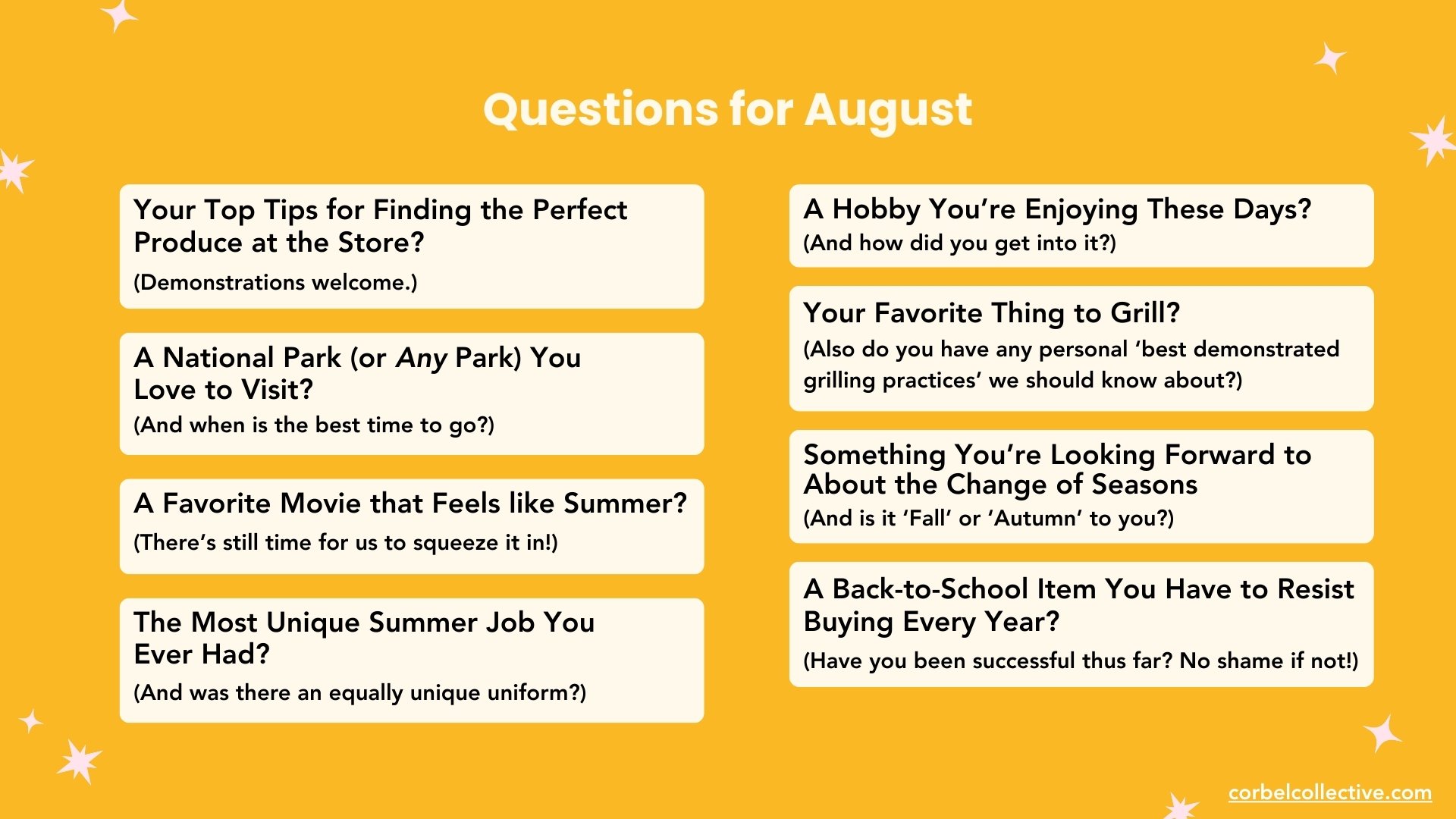 Every team is different. But if your remote or hybrid team is struggling to feel connected, try making a Question Menu for your next group meeting. You may just learn your data analyst has a side hustle on Etsy making tiny baked clay vegetables.
